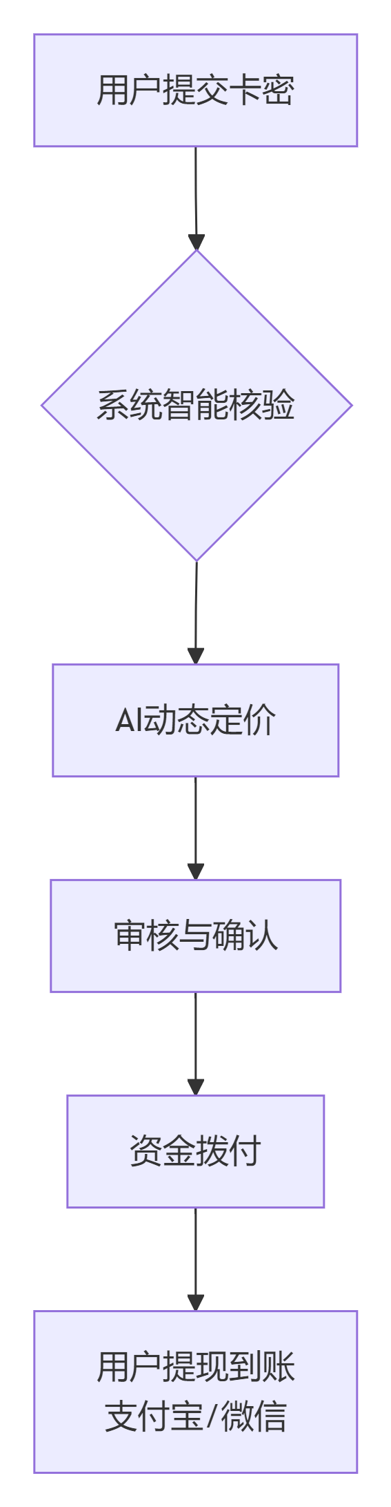 在众多线上回收平台中,卡卡同盟作为行业头部平台,体现了这一领域的最新发展方向。该平台隶属四川聚元汇网络科技有限公司,运营已超过10年。卡卡同盟首创了京东E卡全天候秒级回收技术,提交卡密后10秒内就能完成验卡和结算全流程。对于瑞祥商联卡等卡种,平均处理时效也仅需3分钟。在回收折扣方面,卡卡同盟普遍提供90%-92%的折现比例。以500元面值的联通充值卡为例,通过该平台可兑换485元现金,较传统线下渠道多收益15元。具体到操作流程,卡卡同盟将其简化为三个核心步骤。下面的流程图展示了从提交卡券到资金到账的完整过程: